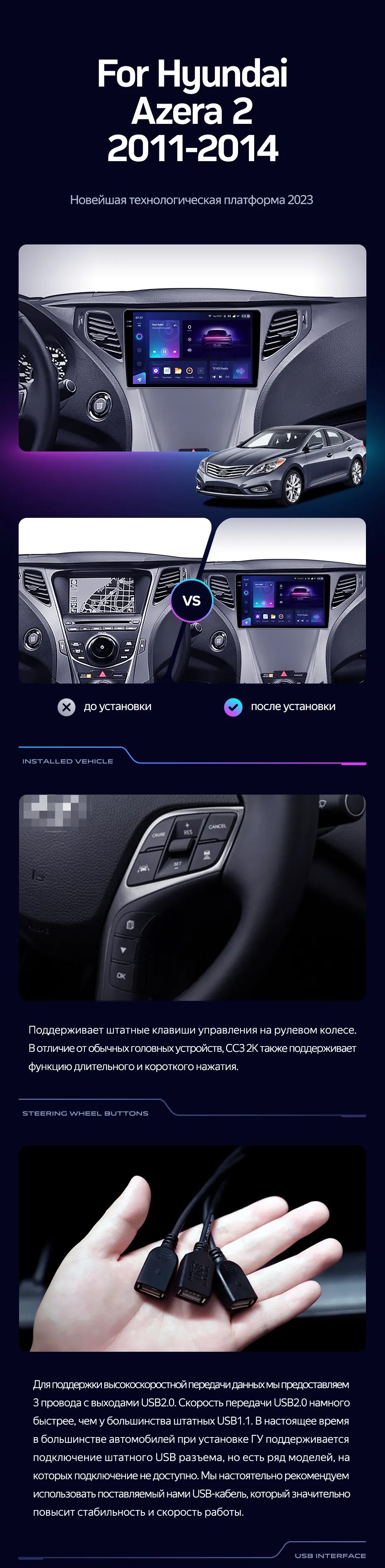 Полный комплект установки магнитолы Teyes с рамкой и проводкой можно выбрать в каталоге штатных магнитол Hyundai Azera 2 (2011-2014).