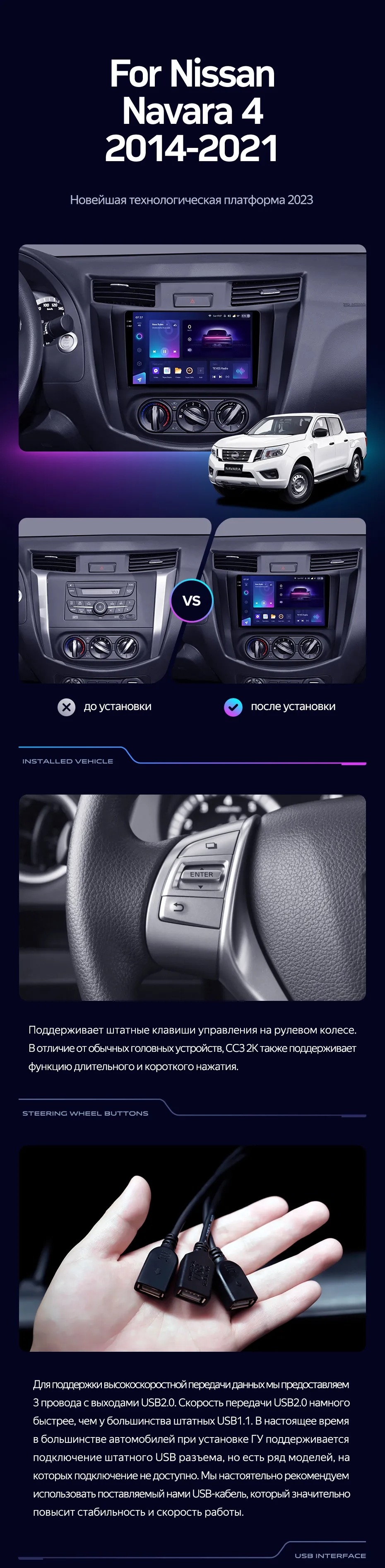 Полный комплект установки магнитолы Teyes с рамкой и проводкой можно выбрать в каталоге штатных магнитол Nissan Navara D23 IV (2014-2021).