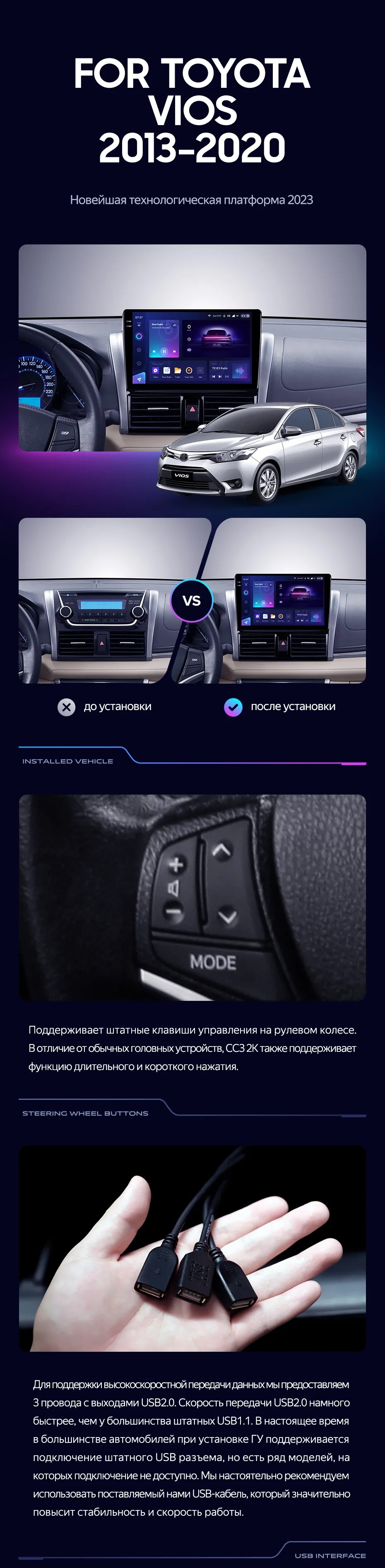 Полный комплект установки магнитолы Teyes с рамкой и проводкой можно выбрать в каталоге штатных магнитол Toyota Vios XP150 (2013-2020).